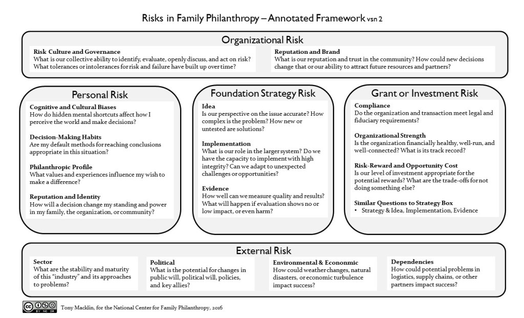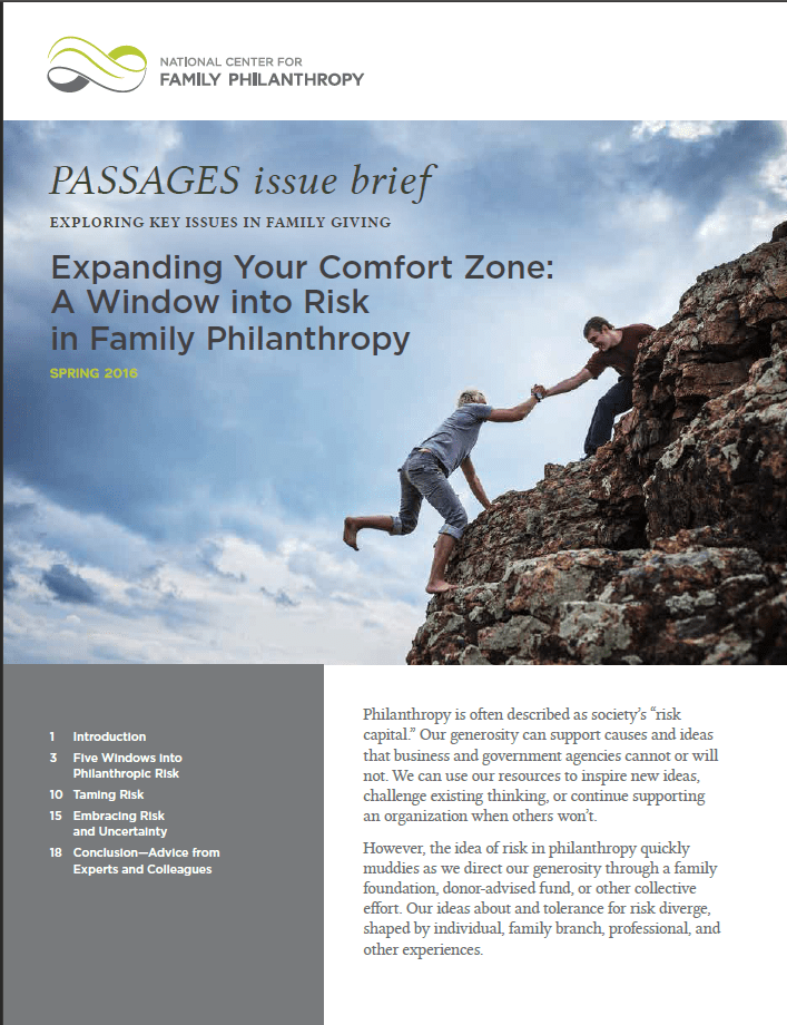 (2016) Issue Brief to help generous families and foundations assess philanthropic risk, tame and mitigate risk, and even expand their comfort zone to embrace uncertainty.